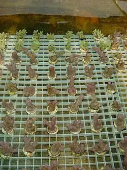 In 2020, the Florida aquaculture industry had over 1,000 certified farms producing over 1,500 aquatic species. Additionally, Florida ranked 9th nationally in 2018 for total aquaculture value among all other US states.[55] In fact, the total reported sales in 2018 was $72 million, according to a survey administered by the Florida Agricultural Statistics Service.[56] In terms of ornamental aquaculture, Florida leads the US in ornamental fish production contributing 45% of the national market. Furthermore, in 2018, Florida's total ornamental fish sales amounted $28.7 million accumulated from 109 operations. For instance, $19.3 million for freshwater ornamental fish, $6.8 million for saltwater ornamental fish, and $793k for Koi. Also, Florida ranked first in 2018 for Koi fish sales in the nation.[55]