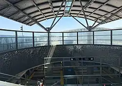 The AirTrain stations at the International Terminal are located one level above ticketing, at both ends of the main hall. Stations at Terminals 1, 2, and 3 are located on level 5 of the domestic parking garage and can be accessed from mezzanine-level skybridges located near security checkpoints B, D, and F. The Garage A and G stations are accessible from level 7 of each garage.[4] The long-term parking station is connected by a skybridge to level 5 of the long-term parking garage.[5] The Garage G station is one level above the BART station at SFO, serving as the system's point of connection with external rail transits.