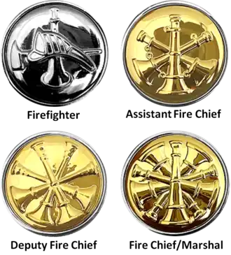 The center shield, or "scramble," of the firefighter's badge is replaced with different bugles to denote different fire officers. One silver bugle with a crossed fire ax and helmet is worn by firefighters, three gold bugles is worn by Assistant Fire Chiefs, four gold bugles for Deputy Fire Chiefs, and five gold bugles for Fire Chiefs and Base Fire Marshals.[2][3]
