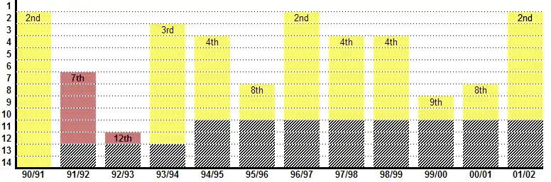 Red = Scottish Football League Premier Division (before Scottish Premier League)