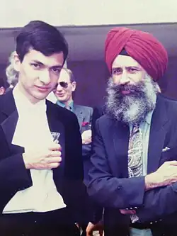 Singh at the 1989 graduation of the Economics BA(Hons) graduates at Queens' College with one of his graduating students, Nigel Cumberland