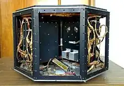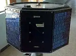 The satellite was octagonal having a height of 47 cm and a diameter of 74 cm, it had an overall weight of 75 kg, sources describe its appearance as that of a "1970's disco-themed coffee table".[1][2] When it comes to the interior of the satellite, it was divided into four bays for protecting the internal electronics from the vibration of launch.[1] The satellite was spin-stabilized and only had passive thermal protection, by black and white paint.[1] The satellite was solar powered, having seven solar batteries and an additional back-up battery.[1][2] When it comes to electronics then the satellite had an onboard data management system, a radio frequency communication system that operated UHF and VHF bands which communicated voice, telemetry and telecommand data and an attitude control system.[1][2]