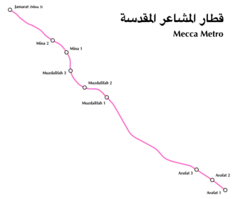 The Al Mashaaer Al Mugaddassah Metro Line[a] or The Sacred Sites Metro Line is a metro line in the city of Mecca, Saudi Arabia used exclusively as a shuttle train for pilgrims between holy sites in Mecca, Mount Arafat, Muzdalifah and Mina to reduce congestion caused by thousands of buses and cars during the Hajj. It is the second metro system on the Arabian Peninsula, after the Dubai Metro.