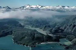In contrast to the volcanic landscape of the refuge, the Pacific coast of the protected area is characterised by rugged cliffs, bays, fjords, and streams. In particular the Castle Cape Fjords in the Chignik area is an extremely pronounced feature, with a strong erosion by the sea, with rocks shaded in contrasting dark and light tones.[2] Notable streams drain into Agripina Bay and Port Wrangell from the glaciers and through the valleys of the refuge.