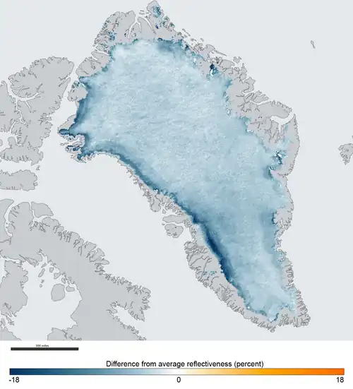 Albedo change in Greenland: the map shows the difference between the amount of sunlight Greenland reflected in the summer of 2011 versus the average percent it reflected between 2000 and 2006. Some areas reflect close to 20 percent less light than a decade ago.[1]