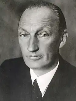 On 8 July 1937, he applied for membership to the Nazi Party and was accepted retroactively to 1 May of the same year (membership number 4.195.343).[5] He was also a member of the Sturmabteilung, National Socialist People's Welfare, German Labour Front and the National Socialist German Doctors' League.[6] He was also head of the specialist group of the Zentrale für Ostforschung.[7]