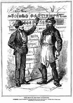 An 1875 Canadian Illustrated News cartoon shows Mackenzie the Mason and Governor General Lord Dufferin the Overseer.