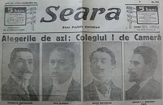 Title page of Seara, with portraits of candidates in the 1914 election; Grigore Gheorghe Cantacuzino's is first on the left