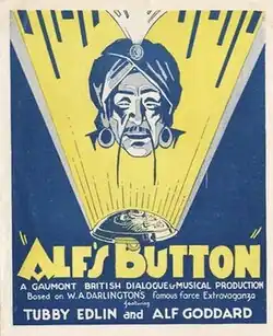 Alf's Button is a 1930 British comedy film directed by W. P. Kellino and starring Tubby Edlin, Alf Goddard and Nora Swinburne. It is an adaptation of the 1920 novel Alf's Button by William Aubrey Darlington. The film features some singing and dancing sequences in an early colour process, which is believed to be Pathécolor.[1]