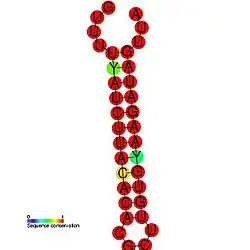 ![]() Predicted secondary structure and sequence conservation of Alfalfa mosaic virus RNA 1 5′ UTR stem-loop | |
