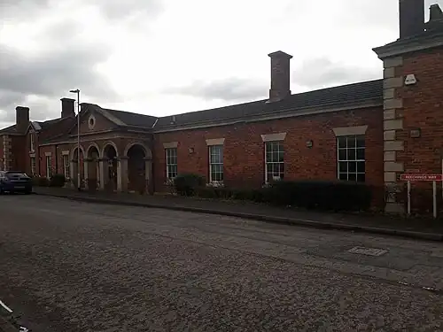 The station building is similar in style to that at Firsby.[6] Access was through a three-arch portico entrance which led to a passageway to the up platform, a large parcels office and the booking office.[6] The southern end of the station comprised the stationmaster's quarters and the ladies' waiting room.[6] Twin facing platforms were provided; a general waiting room, storeroom, stationmaster's office and porter's room were located on the up platform.[6] The platforms were initially covered by a roof which was subsequently replaced after the Second World War.[6] A signal box was situated on the up side next to the road crossing to the north-west of the station.[6] Behind the up platform lay a goods yard with a loading dock, goods shed capable to taking 9 wagons which also served as a grain store and a 15-ton crane.[6] The shed and crane were destroyed during a bombing raid in the Second World War, which led to Alford's only wartime casualty: the shunt horse driver who was on fire watch in the yard.[6]