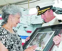 Dolia Gonzalez accepts a painting of her son from Commander Brian Fort during a change of command ceremony for the USS Gonzalez in 2009