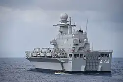 Kalaat Beni Abbes (L-474) (Arabic: (474) قلعة بني عباس) is an amphibious transport dock[2] of the Algerian National Navy. The ship built by the Italian firm Fincantieri as an enlarged and improved version of the San Giorgio class. The ship measures 143 metres (469 ft) long and 21.5 metres (71 ft) wide.[2]