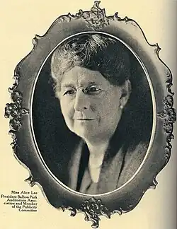 In 1902 Lee moved to San Diego to find a better climate for her health problems. When she first moved to San Diego she met the Marston family, who were already involved in the Progressive movement. Lee was a supporter of the Progressive movement, and other than Theodore Roosevelt, she was friends with Florence Nightingale, Ralph Waldo Emerson and the family of Amos Bronson Alcott.[1] Lee joined the movement through the Marston family and through Theodore Roosevelt’s role in the Progressive Party. She fought for social and political reform. She encouraged women to vote by campaigning for Franklin Roosevelt in 1932.[4][3] She represented the California Progressive Party at the National Convention held in Chicago, Illinois after they noticed her contributions.[1] By campaigning for Franklin Roosevelt in 1932 she would help women's suffrage and increase women's political rights.[1][2][6][7][8]