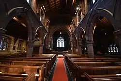 Inside the church, the arcades are carried on plain octagonal columns.[1] The pulpit is Jacobean with carvings of heads of angels which Richards considers to be possibly the most elaborate of their kind in the county.[10] It also includes a carving similar to the griffin in Alice's Adventures.[5] The font dates from the 19th century and was the gift of Miss Elizabeth Wood. Its elaborate wooden cover was given by Lady Greenall. There is a green man carved in the re-used Jacobean rood screen behind the altar.[5] The oak bench ends are carved with "inventive tracery-work".[13] In the belfry is a board with an acrostic on the name "Daresbury".[14]