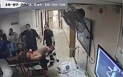 On 19 November the IDF released footage down the tunnel shaft of what it claimed to be a Hamas tunnel network. The footage showed a tunnel shaft, which contains a winding staircase approximately three meters deep and it continues for seven meters down until it reaches part of a tunnel network. The tunnel continues for five meters before turning right and continuing for another 50 meters. At the end, there is a blast door and what the IDF says is a gunhole.[73] Mounir El Barsh, the Gaza health ministry director, stated the Israeli tunnel statement was a "pure lie" and that the IDF had already been on the al-Shifa complex for eight days.[74] Later that day, the IDF also published surveillance footage taken by the hospital's cameras, showing a group of men forcibly bringing two hostages into the hospital. Hamas responded by dismissing the footage, with senior political bureau member Izzat al-Rishq stating that they had repeatedly taken several captives to hospitals for medical care, "particularly because some had been wounded in airstrikes" by Israel. "We have released images of all that and the army spokesman is acting as if he has discovered something incredible," he added.[57] Hamas further stated that Israel’s allegation of using Al-Shifa to detain hostages was “misleading and false,” asserting that hostages were treated in hospitals before being returned to their places of detention.[58] The former hostage Ori Megidish said that she had been treated in the hospital, while another hostage who was brought to the hospital wounded was, according to her understanding, killed by a doctor.[75]