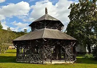 Alleghany Springs Springhouse is a historic spring house located on the former grounds of Alleghany Springs, at Alleghany Springs, Montgomery County, Virginia. It was built about 1890, and is a two-tier, rustic, hip-roofed, octagonal pavilion. The structure is supported on rough cedar posts with complex intertwined knots of rhododendron branches and roots forming brackets, railings, and even vaulted "ceilings." At the center of the structure is the Alleghany Spring, that has been blocked.[3]