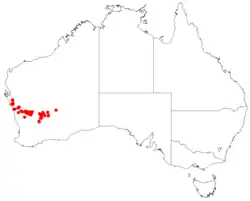 Northern sheoak grows in hilly country between the Murchison River, Paynes Find and the Die Hardy Range in the Avon Wheatbelt, Coolgardie, Geraldton Sandplains, Murchison and Yalgoo bioregions of south-western Western Australia.[3][2]