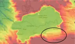 Alluvial fans also develop in wetter climates when high-relief terrain is located adjacent to low-relief terrain.[37] In Nepal, the Koshi River has built a megafan covering some 15,000 km2 (5,800 sq mi) below its exit from Himalayan foothills onto the nearly level plains where the river traverses into India before joining the Ganges. Along the upper Koshi tributaries, tectonic forces elevate the Himalayas several millimeters annually. Uplift is approximately in equilibrium with erosion, so the river annually carries some 100 million cubic meters (3.5×109 cu ft) of sediment as it exits the mountains. Deposition of this magnitude over millions of years is more than sufficient to account for the megafan.[40]