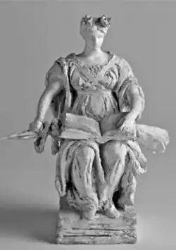 French went through several designs: the original plaster model he made for Alma Mater showed her with her hands in her lap, with her left hand holding the book that lay on it, and her heels touching. Though Goelet and President Seth Low were "greatly delighted" by French's first draft, their critiques led French to change her arms to be outstretched and holding a scepter.[6] His final design for the statue was approved on March 4, 1901, by the Trustees, and the price to be paid by the Goelets was determined to be $20,000 ($755,920 in 2024).[8] McKim, who was greatly worried about the quality of the statue given its prominent location in front of Low Library, was reportedly "delighted", describing the statue as "dignified, classic and stately... exhibiting as much perception of the spirit and freedom of the Greek as any modern can."[9]