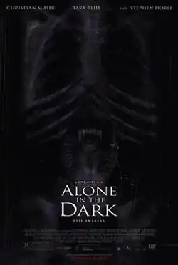 Alone in the Dark is a 2005 action horror film directed by Uwe Boll and written by Elan Mastai, Michael Roesch, and Peter Scheerer. Based on the video game series of the same name, it stars Christian Slater, Tara Reid, and Stephen Dorff as paranormal investigators who combat a supernatural threat. The film's story is a loose adaptation of the game Alone in the Dark: The New Nightmare (2001).