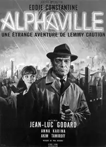 Alphaville (subtitled Une étrange aventure de Lemmy Caution, "A Strange Adventure of Lemmy Caution"[1]) is a 1965 French New Wave tech noir film written and directed by Jean-Luc Godard, and starring Eddie Constantine, Anna Karina and Akim Tamiroff. The film combines the genres of dystopian science fiction and film noir. There are no special props or futuristic sets: instead, the film was shot in real locations in Paris, the night-time streets of the capital becoming the streets of Alphaville, while modernist glass and concrete buildings (which in 1965 were new and strange architectural designs) represent the city's interiors. Although the film is set in the future, the technologies used and the corporations and events mentioned in the film place them firmly in the 20th century; for example, Caution describes himself as a Guadalcanal veteran.