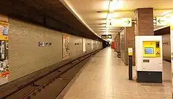 The Alt-Tempelhof station was finished to a design by Bruno Grimmek, who retired soon afterwards; his successor as architect with the Berlin U-Bahn, Rainer Rümmler, assisted with this station and was responsible for the others in the line extension.[4][5] Like all the extension stations, it has a centre platform and exits at each end and is utilitarian in appearance. The Alt-Tempelhof station has grey-green tiles on the walls and brick cladding on the platform columns.[6]
