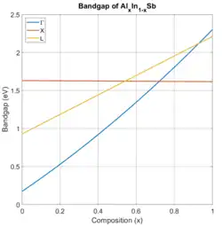 The bandgap and lattice constant of AlInSb alloys are between those of pure AlSb (a = 0.614 nm, Eg = 1.62 eV) and InSb (a = 0.648 nm, Eg = 0.17 eV).[2] At an intermediate composition (approximately x = 0.72 – 0.73), the bandgap transitions from an indirect gap, like that of pure AlSb, to a direct gap, like that of pure InSb.[4]