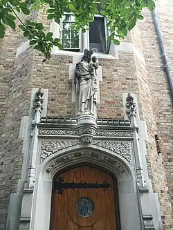 The hall's chapel is dedicated to St. Charles Borromeo, the patron saint of then-president Fr. Charles L. O'Donnell, CSC, and it features statues richly decorated neo-gothic interior with side altars with statues of Mary and St. Thomas Aquinas.[45][46][47] The altars were installed in March 1932, and were made in and imported from Italy through the work of John F. O'Hara, then prefect of religion.[47] The altars are made of Carrara marble and designed in gothic style of the rest of the building.[47] It is the site of numerous religious events, including Latin Mass and a commemoration of the Armenian Genocide.[48][49][50][51]