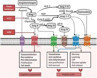 The renin-angiotensin system (RAS), which is involved in blood pressure regulation, plays a unique and important role in the brain.[17] The RAS system involves the proteins angiotensinogen, renin, and ACE, all of which are present in the brain.[18] Renin is an enzyme that cleaves angiotensinogen into angiotensin I (Ang I), while ACE converts Ang I into Ang II.[18] Ang II can either bind to the angiotensin II type 1 receptor (AT1R), which promotes inflammation and damages neurons, or the AT2R, which reduces inflammation and protects neurons.[18] At higher levels of Ang II, the AT1R is preferably activated, causing inflammation, decreased blood flow to the brain, and cognitive impairment in the long term.[18] Ang II can be cleaved by ACE2 into more neuroprotective species, such as Ang III and IV, which counteract the effect of Ang II.[18] In AD, AT1R signaling has been shown to be increased, contributing to neurodegeneration and cognitive impairment.[29]