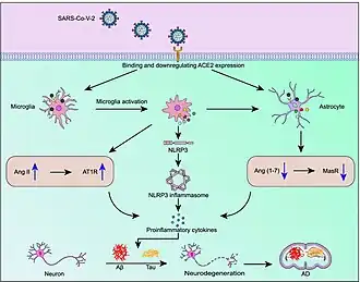 Studies have shown involvement of the NLRP3 inflammasome in AD.[21] The expression of genes related to inflammasome activation were shown to be increased in AD, while stimulation of immune cells with Aβ42 can directly activate it.[21] Aβ plaques and oligomers can function similar to DAMPs, priming and activating the NLRP3 inflammasome. Additionally, Aβ that has been phagocytosed by microglia can damage lysosomes, cellular structures containing waste, causing release of cathepsin B, an endogenous molecule that can activate the NLRP3 inflammasome.[21] Consequently, activation of the NLRP3 inflammasome prevents microglia from ingesting Aβ42, creating a positive feedback loop towards neuroinflammation as Aβ buildup can further activate additional inflammasomes.[21] NLRP3 activation can also arise from hyperphosphorylated tau, and can consequently lead to additional tau phosphorylation. This chronic activation of the NLRP3 inflammasome ultimately contributes to chronic inflammation and neurodegeneration in AD. Being a virus, SARS-CoV-2 can activate the NLRP3 inflammasome, triggering inflammation required to fight infection.[22] It is through this mechanism that SARS-CoV-2 is thought to increase deposition of toxic Aβ42 and hyperphosphorylated tau, worsening AD pathology. The subsequent increase in inflammatory cytokines can further lead to neurodegeneration and cognitive impairment.