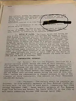 For the most part, players were assigned to teams on a regional basis to increase fan loyalty stemming from their college experiences. The Syracuse team was made up of mostly Syracuse University and Hobart College players; The Boston team made up of University of Massachusetts and Brown University players; the Baltimore team consisted of Johns Hopkins, University of North Carolina and Loyola University athletes; the Denver Rifles had players hailing from The University of Colorado, Colorado State University and Colorado College etc. Players were signed to uniform two-year contracts that paid $4,800 the first year and $6,000 in 1989. At that same time the MILL (the indoor league) was still paying its players $100 per game.[12] The first player officially signed by the league was Greg Fisk, an All-American Midfield hailing from the University of Massachusetts and signed to the Boston Militia.[13]