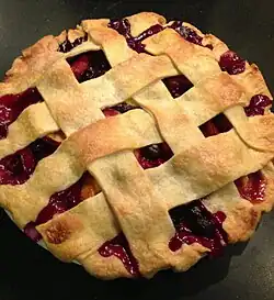 A basic cherry pie can be made by simmering cherry juice with sugar, cornstarch and a pinch of salt in a saucepan until thickened. Once thickened, butter is stirred in, then the mixture is poured over the pitted cherries into a pastry-lined pie dish and baked in a hot oven. Lattice top crust is a common choice for cherry pies.[37]