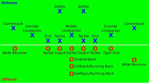 Defensive formations are often known by a numerical code indicating the number of players at each position. The two most common formations are the 3–4 defense and the 4–3 defense, where the first number refers to the number of defensive linemen, and the second number refers to the number of linebackers (the number of defensive backs can be inferred, since there must be eleven players on the field). Thus, a 3–4 defense consists of three defensive linemen (usually a nose tackle and two defensive ends), four linebackers, and four defensive backs (two cornerbacks, a strong safety, and a free safety). Some defensive formations will directly indicate the number of defensive backs. The 3–3–5 defense, for instance, has 3 defensive linemen, 3 linebackers, and 5 defensive backs.Source:[3]