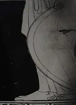 There are two theories about who is depicted here. On the one hand, it has been suggested that the young man is Achilles receiving from his mother Thetis the weapons made by Hephaestus during the Trojan War and that the image derives from a scene in book 19 of Homer's Iliad.[2] A detail of this vase supports this theory: under the shield there are several lines from the vase painter's preliminary sketches. These sketches were engraved in the half dried clay before the firing in the slip with which it was covered before being fired. In these it can be seen that the female figure was originally intended to be naked. Generally, the only women who were depicted naked in Greek art were goddesses, mythological figures like Maenads or Nymphs, and prostitutes.
