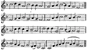 Lines five to eight of the hymn tune have this melody, each line represented by a bar:[12]