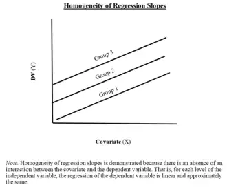 The slopes of the different regression lines should be equivalent, i.e., regression lines should be parallel among groups.