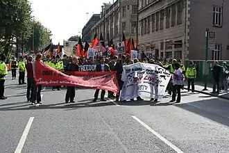 In March 2009, Anarchist groups in London participated in "Put People First" march through central London against G20 policies. The anarchist "G20 Meltdown'" declared April 1st "Financial Fools Day" and called for a "carnival" assembly outside the Bank of England.[78] Breaking away from a crowd of 7,000, a small number of activists ransacked an office of the bailed-out Royal Bank of Scotland (a professional photographer claimed to have seen what he presumed were police "agents provocateurs" instigating violence).[79] In March 2011, a half-million strong anti-austerity demonstration called by the TUC in London, was in part "hijacked" by anarchists who attacked The Ritz Hotel, smashed the window of West End banks and fought the police. They justified the violence by citing the failure of the even larger anti-war march inn 2003 to stop the invasion of Iraq: political change, they suggested was not "predicated on being right and winning a debate".[80]