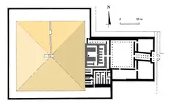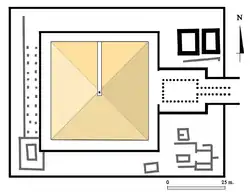 Khafre's pyramid has five pits that once contained funeral boats, with a deep cleft in a rock suggesting the possibility of an unfinished sixth boat.[14] These boats are all made of stone. There are two boats on the north side of the pyramid and two boats on the south side. Both rows of the boats are oriented east-west. The western boat of the two boats in the north is covered by white limestone and a cabin. These characteristics are shared by the western boat of the two boats in the south. These characteristics suggest that these two boats were the Night-boats of Ra, which are the mythological boats that Ra would have embarked on during the nighttime. In contrast, the other two boats lacked a cabin, and are thus categorized as Solar-boats of Ra. The two solar boats, known as the Northern-Day Boat and the Southern-Day Boat, lack the sharply incurved stern post that is popular in later iterations of solar boats and pictures like the Pyramid Texts and Palermo stone.[15] The fifth boat is located south of the pyramid, but is perpendicular to the pyramid instead of parallel.[16]