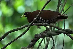 This is the largest Rallina, measuring about 34 cm in length.[4] It has a glossy chestnut plumage, extensive bold barring on underparts, unbarred undertail-coverts, relatively bright apple-green bill and relatively long and fluffy tail; legs and feet are olive-green. It also has pale barring on wings confined to outer primaries and greater and medium coverts.[4][5] Juveniles are duller and less prominently barred.[6] Other similar looking crakes include other Rallina and ruddy-breasted crake Porzana fusca. They are smaller and do not have green bill and legs.[6] Immature birds are duller overall with the barred areas being dark grey-brown with a chestnut tinge, narrowly banded and streaked dirty white. Juvenile birds are paler than adult.[4] Voice is a deep croak. It utters a sharp click as an alarm call.[4]