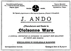 It is one of the very few traditional cloisonné companies still left in Japan.[1] The main store in Sakae has a small museum with objects by the Andō company and also Namikawa. Objects from Ando are held in the collection of the Walters Art Museum and in the Victoria and Albert Museum.[5][1]