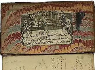 Barclay was one of a group of Scottish bookbinders and booksellers who, at the age of 21, emigrated to the colonies and worked in Boston before and during the War for American Independence. His brother John arrived at Boston six years thereafter.[4] A small percentage of bookbinders ever distinguished their work by including their signature trade label on the inside cover of the works they bound. Subsequently, bookbinder's trade labels are seldom found in the various works that were published in eighteenth-century colonial America. The various works bound by Andrew Barclay containing such labels are considered among the rare exceptions to that advent, with only a few known surviving examples.[1] Historians in this field have searched the rare book departments in various public and university libraries for these labels and have only found several examples. They maintain that the books containing binder's trade labels have largely gone unnoticed or unidentified and hope that more examples are yet to be found pending continued searches.[5]