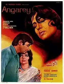 Angarey is a Pakistani film directed by Fareed Ahmed. It stars Shamim Ara, Nadeem, Nisho, Masud Akhtar and Agha Talish in lead roles. It was released on 15 September 1972. The music composition was provided by A. Hameed.[1]