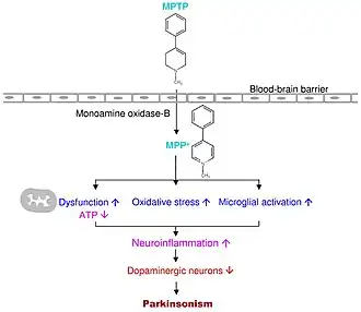 - ^ Rodriguez-Pallares, J.; Parga, J. A.; Muñoz, A.; Rey, P.; Guerra, M. J.; Labandeira-Garcia, J. L. (2007-06-15). "Mechanism of 6-hydroxydopamine neurotoxicity: the role of NADPH oxidase and microglial activation in 6-hydroxydopamine-induced degeneration of dopaminergic neurons". Journal of Neurochemistry. 103 (1): 070615193023005––. doi:10.1111/j.1471-4159.2007.04699.x. ISSN 0022-3042. PMID 17573824. S2CID 20714033.