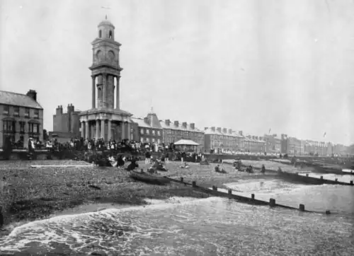 Besides straightforward compassion for the poor, there are two other possible motivations for Mrs Thwaytes's philanthropy. Firstly there was the 19th-century progress of Evangelicalism, which encouraged good works from those with religious sensibility and social pity. Secondly, following the expansion of the middle classes in the 18th and 19th centuries, beneficence was "an avenue for entry into elite society for women and gave them a sense of place and direction outside the home."[21] In other words, for a woman of known humble origins and at the same time a wealthy widow looking for a place in society, philanthropy would be in her best interests. However 19th-century British elite society was based in the popular imagination upon elegant culture, not money or good deeds, and Herne Bay Clock Tower's opening ceremony drew mockery from the Figaro in London of 6 October 1836, in which she was called a Cockney and her clock, celebration and philanthropy laughed at.[22]