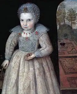 Anne Newdigate had five children of which the eldest was Mary (1598–1643). The eldest son John Newdigate (1600–1642) was his father's heir, the next Richard Newdigate (1602–1678). The last two were daughters - Lettice (1604–1625), and Anne (1607–1637).[2] Lettice attended the Ladies Hall school at Deptford from July 1617.[4] Her portrait, aged 2, now at Arbury Hall, includes one of the earliest depictions of an English knot garden.[5] Anne could have been excluded from society after moving to Arbury but she was a keen correspondent.[2] Her family connections included: Sir William Knollys who was the Earl of Bedford and the Lord Chamberlain of the Household), Vice Admiral Sir Richard Leveson; Sir John Tonstal who was an usher to Anne of Denmark; Lettice, Lady Paget; and Elizabeth, Lady Grey. All of these were godparents to her children.