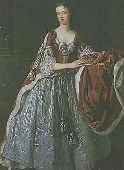 Anne Churchill was the third daughter of John Churchill, 1st Duke of Marlborough, and Sarah Jenyns. She was named after Princess Anne of Denmark (the future Anne, Queen of Great Britain) who was Anne Churchill's godmother. Anne Churchill was also goddaughter of Anne Digby, the Countess of Sunderland (her future mother-in-law).[5] As her father was created a sovereign prince by the Holy Roman Emperor Joseph I, Anne was also a princess of the Holy Roman Empire and later of the Principality of Mindelheim.[9] Lady Sunderland also looked after Anne and her sister Henrietta when they were little children, when Sarah had to perform her duty at court. Lady Sunderland was also the one who witnessed when Anne had her first tooth.[10]