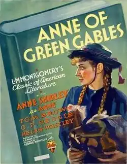 Anne of Green Gables is a 1934 American comedy drama film directed by George Nicholls, Jr., based upon the 1908 novel Anne of Green Gables by Canadian author Lucy Maud Montgomery. Dawn O'Day, who portrayed the title character in the film, changed her stage name to Anne Shirley, which she was billed as for this and all subsequent roles. The film was a surprise hit, becoming one of four top-grossing films RKO made that year as noted in The R.K.O. Story, published by Arlington House.