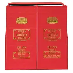 The XXXI edition (2007-2010) [10] was published in four volumes in December 2010 on the occasion of the 150th anniversary of the Unification of Italy and was awarded the Golden Shield (Italian: Scudo d'Oro) prize of the Centre for Heraldic Studies (Italian: Centro per gli Studi Araldici).[11] The XXXII edition, covering the years 2011-2014, was published in December 2014 and presented on 7 February 2015 at the Pontifical Athenaeum Regina Apostolorum and at the Campidoglio, in the hall of the Protomoteca. The XXXIII edition of 2015-2020, in two volumes of 5851 pages plus tables and index, was printed in early 2021. It contains, in addition to genealogical updates of more than 11000 families, unpublished documents on the dynastic succession in the deposed Houses of Savoy,Bourbon Two Sicilies, Bourbon Parma and Habsburg Lorraine (the latter developed in a separate treatise).