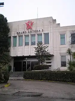 Antena 3 (Antena Tres) is a Spanish terrestrial television channel part of Atresmedia, of which it is the flagship station. Its current headquarters are located in San Sebastián de los Reyes.